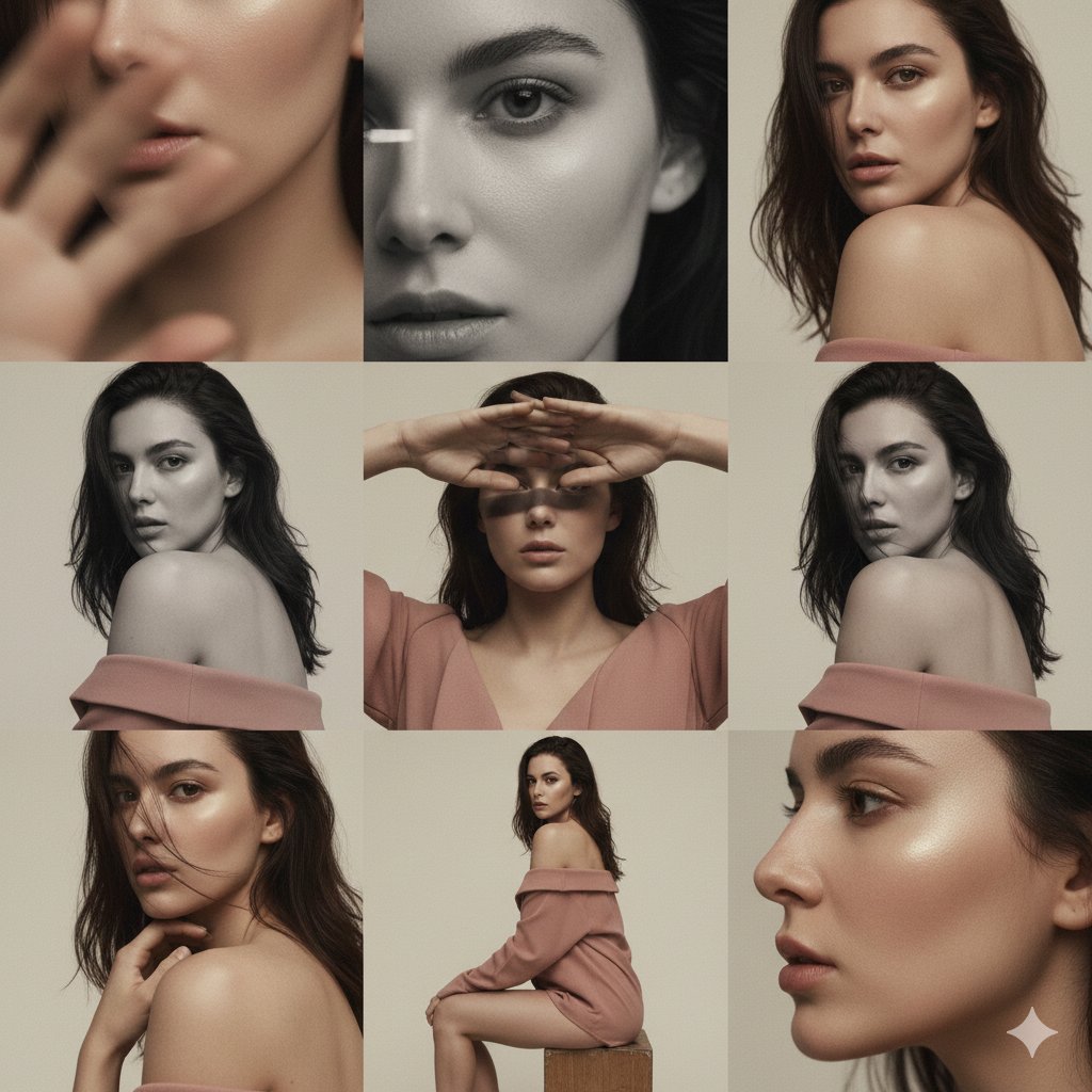Editorial 3x3 grid in matte cream studio. Character (face characteristics 100…