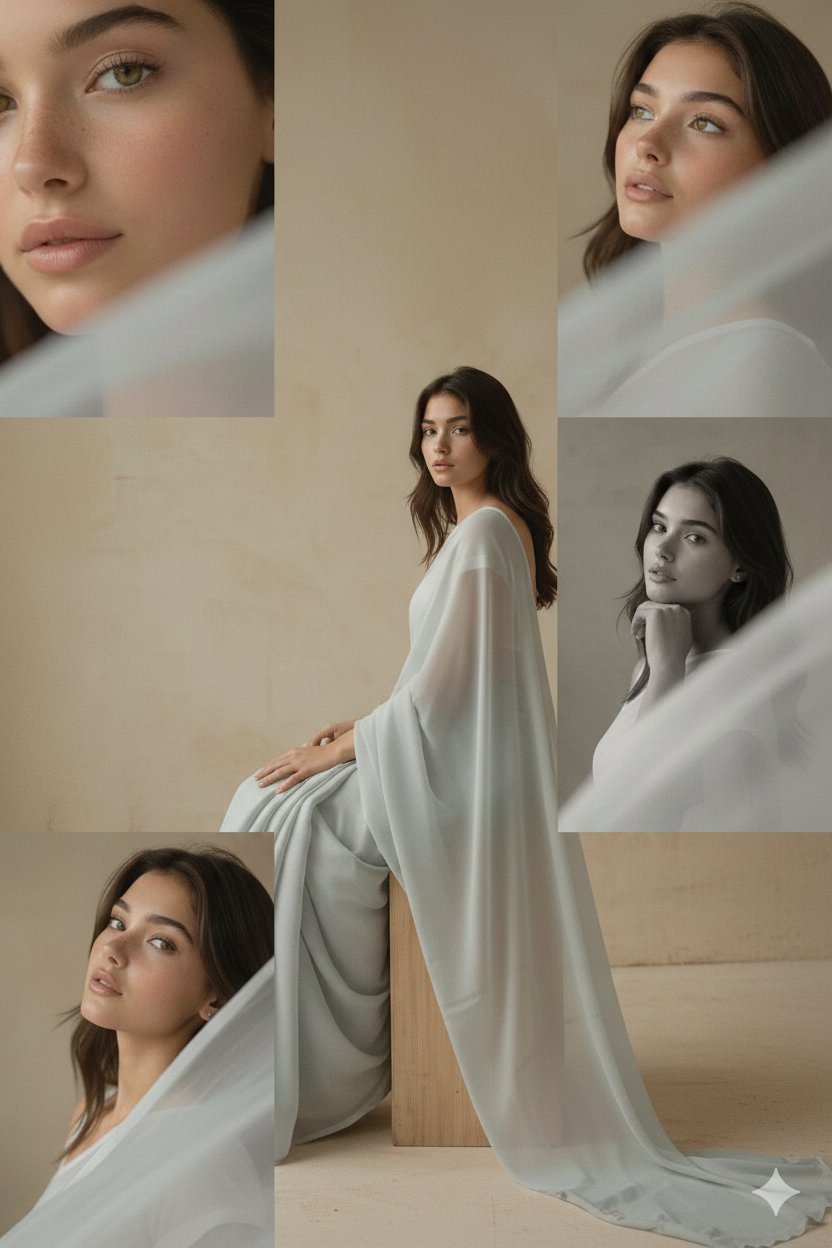 Collage (5-photo asymmetrical layout): A mixed-layout 5-photo editorial collage on pastel background. Large main frame: half-body sideways sitting on wooden block (35mm f/4.5). Supporting frames: cheek macro with blurred pallu (85mm f/1.8), reflective eye crop (85mm f/2.0), B&W close portrait (50mm f/2.2), soft over-shoulder view (85mm f/2.0). Keep face characteristics 100% same as uploaded image. Subtle film grain + elegant tonal palette.