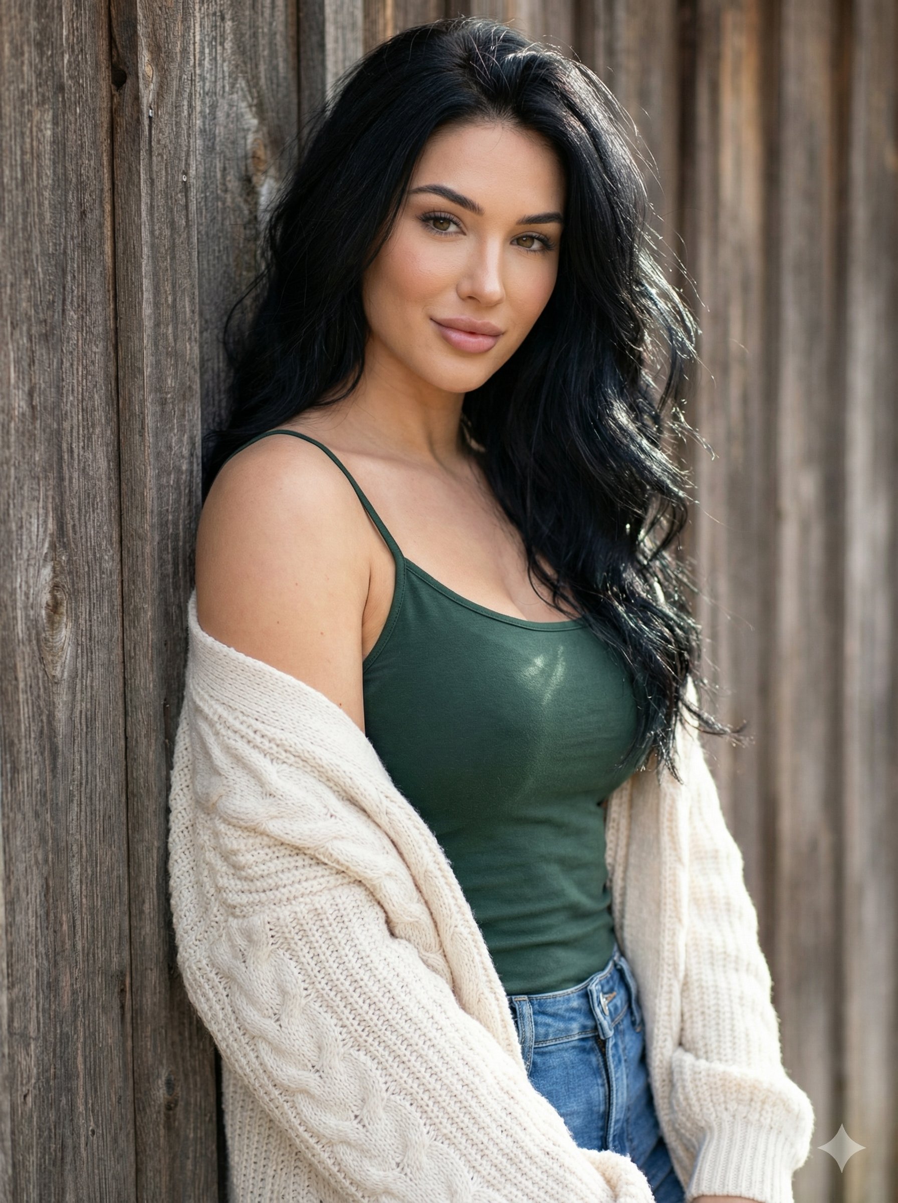 Young woman with a gentle, inviting soft smile. Light-catching, messy and naturally flowing. Photorealistic skin, highly detailed. Full body shot, leaning casually against a rustic, weathered wooden plank wall outdoors. Subject in sharp focus with textured background depth. Natural soft light catching hair highlights, realistic shadows. Color palette: dark green, cream, blue denim, rustic wood tones. Photorealistic style, professional digital camera look, high definition, true-to-life detail. Maintain 100% facial likeness and identical facial features to the reference image using FaceID or IP-Adapter (strength 1.0). Negative prompt: Anime, cartoon, illustration, sketch, digital painting, low quality, 3D render, CGI, plastic skin, doll-like texture, airbrushed smoothing, unnatural lighting, low resolution, overexposure, blur