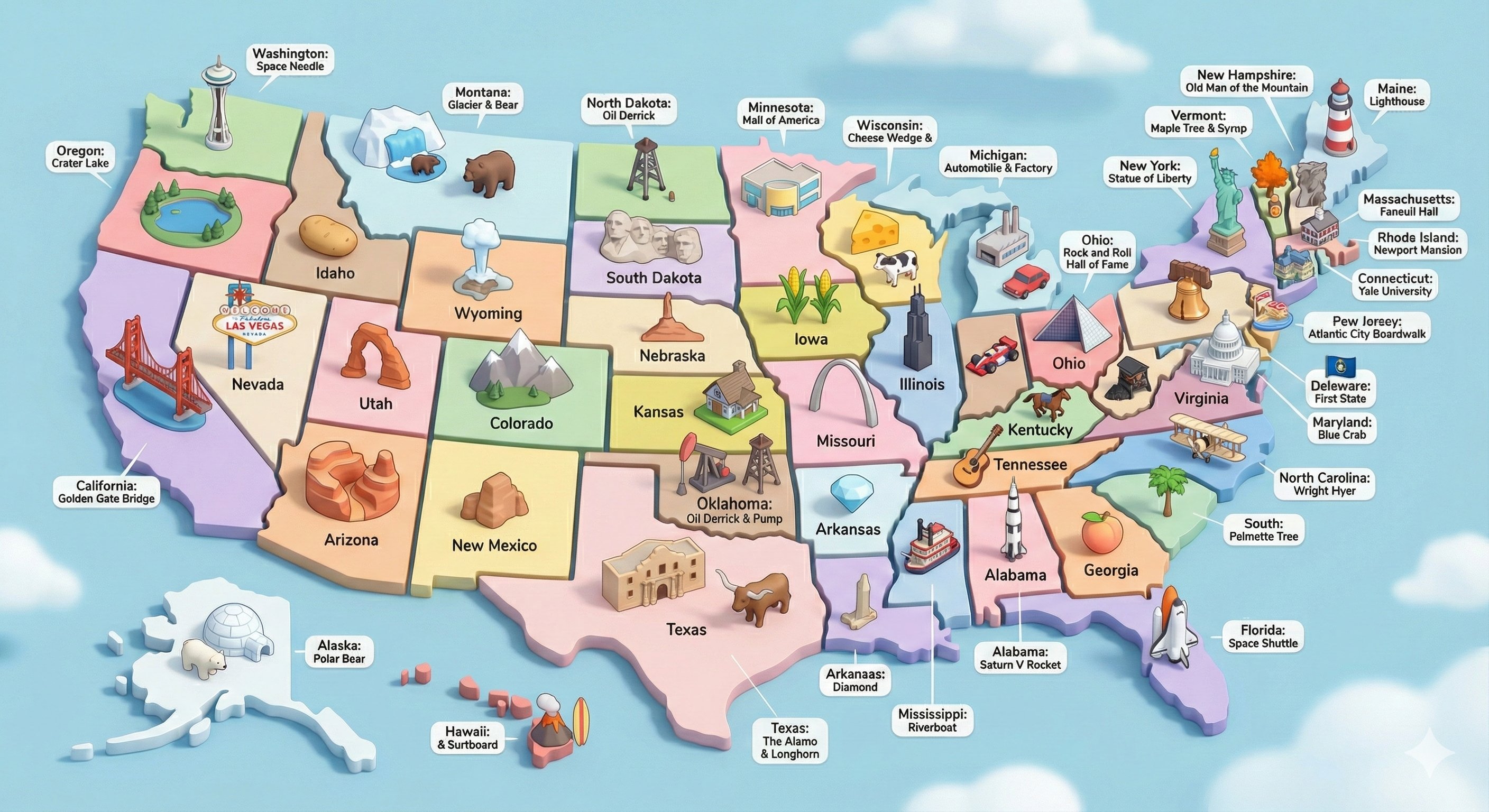 Create a high-detail 3D isometric diorama of [Country], where each state is represented as its own miniature platform. Inside each state, place a stylized, small-scale 3D model of that state’s most iconic landmark. Use the same visual style as a cute, polished 3D city diorama: soft pastel colors, clean materials, smooth rounded forms, gentle shadows, and subtle reflections. Each landmark should look like a miniature model, charming, simplified, but clearly recognizable. Arrange the states in accurate geographical layout, with consistent lighting and perspective. Include state labels and landmark labels in a clean, modern font, floating above or near each model.
