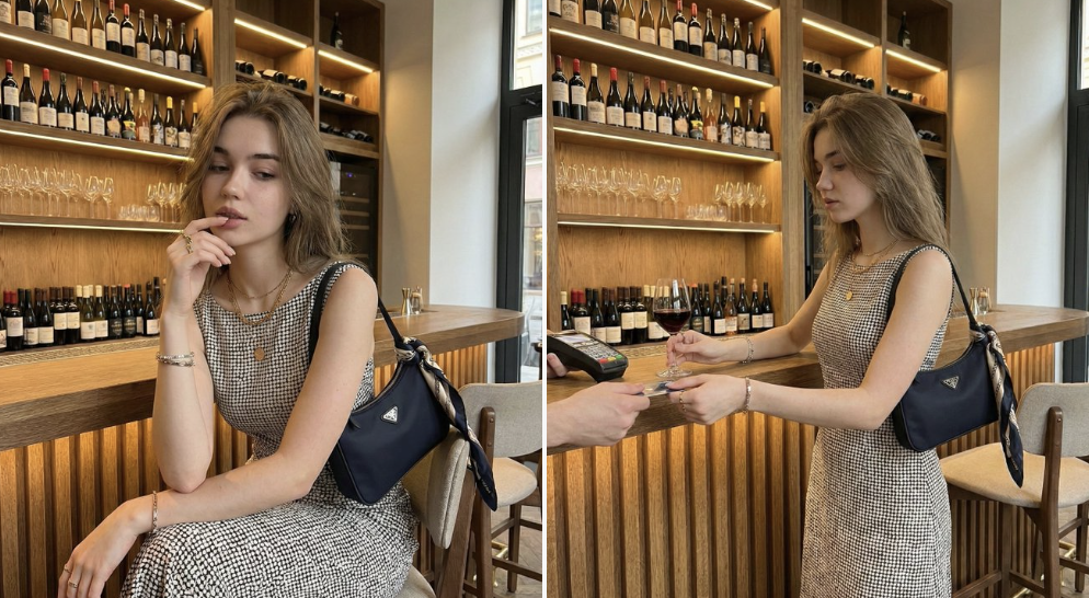Use the uploaded photo as the exact face and identity reference. Preserve all facial features, expression, makeup, and hairstyle with perfect structural accuracy. Create an indoor lifestyle fashion portrait in an elegant wine bar. Three-quarter seated shot at eye level. Warm ambient lighting from bar shelves and ceiling lights. Mood is elegant, relaxed, slightly playful. Subject is sitting sideways on a bar stool, one hand near the lips, the other resting on the chair back, looking slightly downward with a soft dreamy expression. Shoulder-length slightly tousled light-brown wavy hair. Wearing a long stylish monochrome patterned evening dress with thin straps, layered gold necklaces, bracelets, and rings. Dark shoulder bag with a patterned scarf draped over the chair. Background features wooden shelves filled with wine bottles, glasses, trophies, and warm decorative lighting. Sharp focus on subject, softly blurred background. Modern chic nightlife aesthetic with rich wood, glass textures, and gold accents.